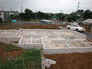 6.基礎出来上がり。仮枠を取り外して基礎の部おわり。写真の手前に見える、長い鉄の棒がホールダウン、短く細いのがアンカーボート。 | |